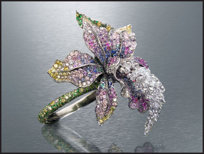 A 24.13-carat rubellite “eye” surrounded by diamond-set petals. The shank is engraved to resemble the lotus stem. Natural fancy vivid yellow, gray, and white diamonds, natural Burmese rubies, Colombian emeralds, demantoid garnets, tsavorites, faint to intense pink sapphires set in gray titanium.