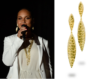 Singer Alicia Keys was a golden Goddess in Hellmuth earrings and a Karine Sultan necklace while performing at the City of Hope’s event at MOCA in Los Angeles on June 12, 2012.