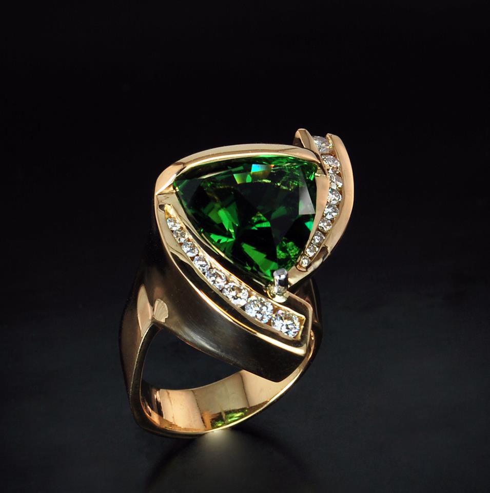 18k yellow gold, David Dawson’s Chrome Tourmaline of Tanzanian origin, unheated/untreated, 6.20 carats in a frame of diamonds, .68 ctw – By Gordon Aatlo Designs |
