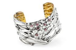 Silver cuffs-plus were also featured in Buccellati’s couture collection. Its blossom cuff with gold exterior touches, made in Italy, is offered at Bloomingdale’s in NYC for $1,300. Works Gallery, also on the upper East side of Manhattan, showcases The Three Bloom Peony Cuff, handcrafted by Galmer in America. Created using the rare repousse’ technique, the cuff features three plump sculptural blooms, gold textured centers and romantic openwork, for $750. As part of the American Estate collection, all made in the USA, Galmer has also touched 24K gold on the exteriors of The Wild Iris Cuff and The Touch of Gold Peony Cuff. Additionally, the Galmer signature is a 24K gold lining inside every cuff in the collection.
