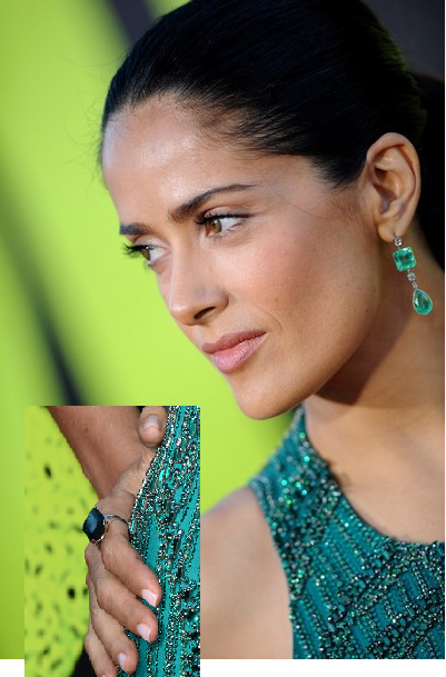 Salma Hayek – Wearing diamond, emerald and platinum chandelier earrings and a large diamond, emerald and platinum cocktail ring by Neil Lane Jewelry at the Premiere of “Savages” – Westwood, CA:- June 25, 2012