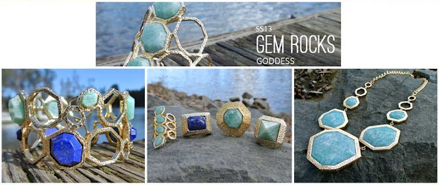 The Gem Rocks Goddess collection features eccentric, eye-catching baubles fit for a Grecian goddess. Fashionistas reveal their inner Aphrodite with jagged-shaped jewels including the goddess power cuff, fringe chandelier earrings and stackable rings in an array of natural stones from green amazonite and blue lapis to golden pearl.