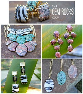 The Gem Rocks Claw collection presents playful patterns and prints inspired by the rich culture, wildlife and landscape of the African safari. Black and white jasper transforms into Zebra claw cocktail rings and pendant necklaces while African turquoise, rose jasper and mother of pearl take the shape of statement cuffs, stackable bangles, bib necklaces and geometric claw link earrings.