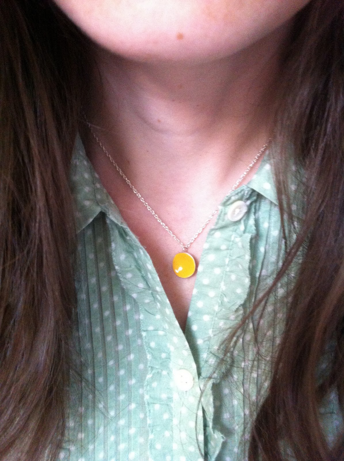 It is so difficult to photograph yourself, at least to get an entire outfit in one shot. Well, I tried. The skirt is a thrifted gap skirt from last year. my shoes are miz mooz, a rare pair of heels you will find me in, I suppose I made an exception for the color yellow. I love how my marigold nasturtium necklace looks with the mint shirt. I suppose it is a habit of working with enamel, you just can’t get away from playing color combinations.