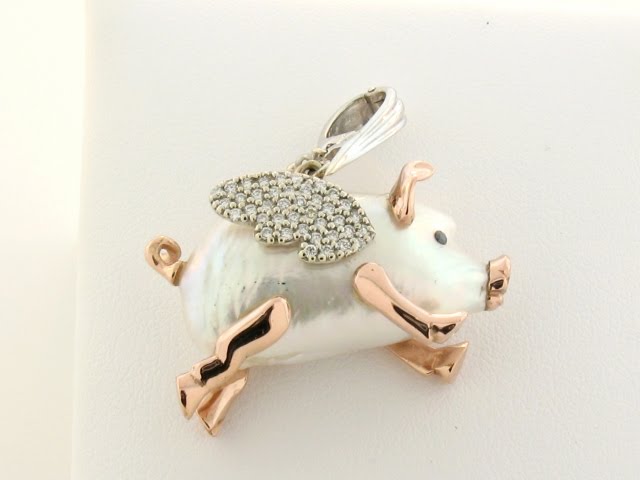 14K rose and white gold “Flying Pig” pendant featuring a Baroque Pearl accented with Diamonds (.50 ctw.).