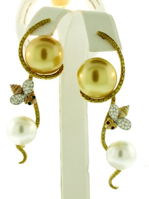 “Bee Line” earrings featuring two 15.6mm golden Pearls and two 12.2mm white Pearls accented with yellow and white Diamonds (3.96 ctw.), Emerald (.06 ctw.), Ruby (.09 ctw.) and Sapphire (.03 ctw.).