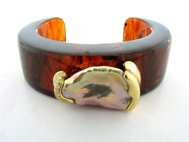 Vintage tortoise-color bakelite cuff featuring a 26×20 Chinese freshwater Pearl and pave Diamonds (0.84 ctw.) set in 18K and 18.5K yellow gold