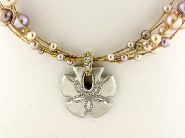 18K yellow gold necklace featuring 98 freshwater Pearls with a platinum and Diamond (.35 ctw.) pendant.