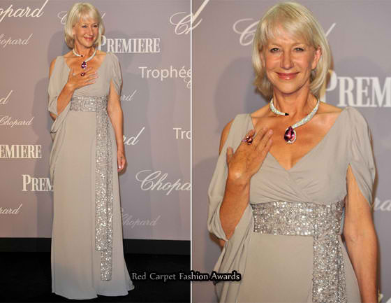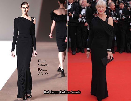 This is a great example of runway to real person – Elie Saab from the runway and on the lovely Helen Mirren – BTW those are Chopard Diamond Cuffs that Helen added to the look.