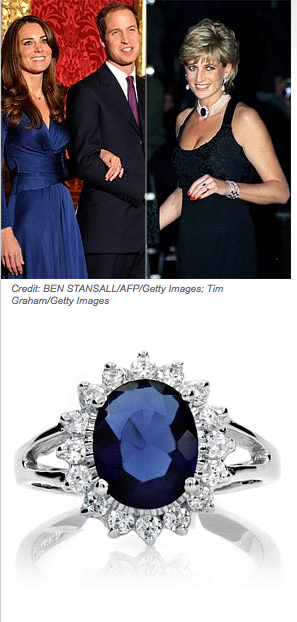 Prince William gave Kate his late mother’s platinum engagement ring that features an 18 carat oval blue sapphire surrounded by 14 smaller white diamonds from Garrard.