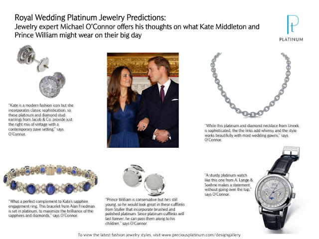 “Kate loves fashion and has a tailored and sophisticated style. She won’t want to be seen as the “Fairy Tale Princess Bride”. I think her jewelry choices will be much more youthful and chic, but with some dramatic elements. She will most likely choose pieces set in platinum since it maximizes the brilliance of diamonds and colored gemstones, which is important as the world watches while she walks down that long aisle.”