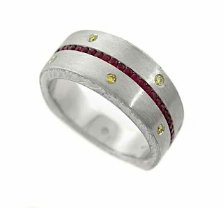 Mark Schneider, Mark Schneider Design – Platinum engraved ring featuring channel-set Ruby melee (.59 ctw.) and yellow Diamonds (.115 ctw.).