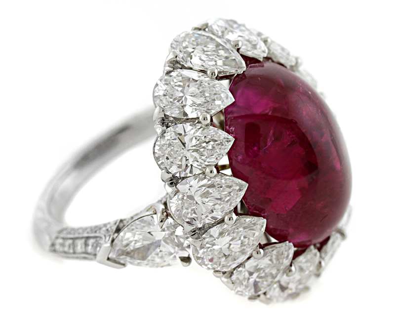 James Currens, J.W. Currens, Inc. – Platinum ring featuring a 14.25 ct. unheated Ruby cabochon accented with Diamonds (7.97 ctw.).