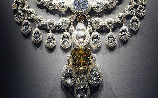 Many maharajas were educated in Europe or by English tutors in India. Some adopted elements of Western dress and culture, such as cricket, fox hunting, and automobile racing. Travel to the West greatly expanded Indian princely patronage, and the new royal patrons had a profound effect on the production of luxury goods in Europe, as manufacturers responded to the tastes of their new clients. These exchanges led designers such as Cartier to introduce Indian-inspired designs to their European clientele. Outstanding among the royal jewels on display is the Patiala necklace designed by Cartier, which originally contained 2,930 diamonds and the yellow 234.69-carat DeBeers diamond.