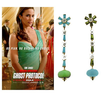 The stunning one of a kind Bulgari earrings, made of yellow gold with turquoises, green tourmalines and round brilliant cut diamonds 2.49 ct.are the obvious choice for Agent Jane Carter, clearly adorning the sophisticated and sexy look of her character.