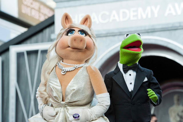 Miss Piggy is wearing a dress by Zac Posen, jewelry from Fred Leighton, shoes by Christian Louboutin, handbag from and hair styled by Kim Kimble. Kermit is wearing a tux from Brooks Brothers.