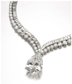 In addition to the Beau Sancy, the sale will feature several jewels with royal provenance. Among them is a necklace suspending a detachable pear‐shaped D colour diamond weighing 41.40 carats and coming from the collection of a member of a royal family (est. CHF 2,750,000‐4,550,000 / $3,000,000‐5,000,000, illustrated left).