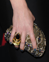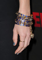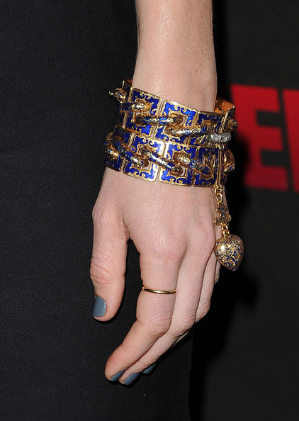 Los Angeles, CA: – April 23, 2012 – Alice Eve – Wearing sapphire and gold earrings, gold and enamel cuff bracelet and a large gold and onyx ring. The jewels complimented a Donna Karan Dress that gave a nod to old Hollywood Glamour! …I think she has blended a stunning Grace Kelly look with a little Kim Novak sexy – what do you think? These jewels deserve a close up…how could you feel anything but elegant in that bracelet?