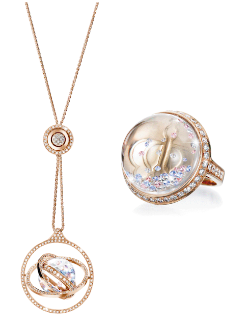 comes a 18kt rose gold pendant with 3.31crt white, 0.80crt blue and 0.80crt fancy pink