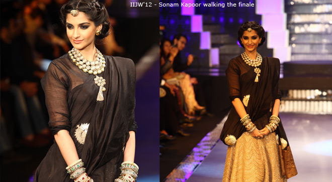 In a gorgeous Anamika Khanna outfit, Sonam Kapoor, elegant brand ambassador of IIJW 2012 entered when a gleaming silver chandelier rose from the stage to reveal her standing under the ramp lights. Wearing a brilliant Polki necklace with a superb tasseled pendant, along with rows of intricate kadas on hands, a Maang Tikka and small ear studs, Sonam Kapoor looked like a beautiful princess as she sashayed down the ramp.