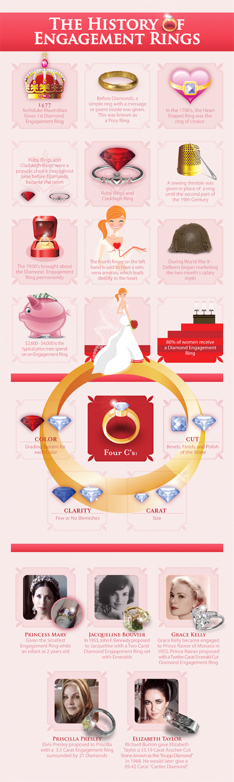 “Take a look at the infographic below and explore more about this tradition, including why it is custom to wear the ring on your fourth finger and who started that whole “2-months salary” myth anyway. Also, learn about the 4 C’s of picking a gem and marvel at the women who wore the most remarkable engagement rings in history.”