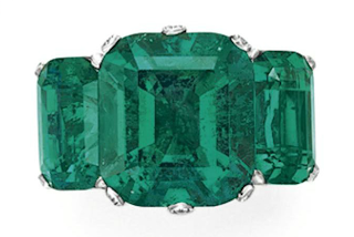 In addition to top colored and colorless diamonds, the Magnificent Jewels sale features an outstanding selection of rare gemstones as well as signed jewels from coveted design firms such as Buccellati, Cartier, David Webb, Tiffany & Co., Van Cleef & Arpels, and Verdura, among others. Among the star lots is an impressive three-stone Colombian emerald ring mounted with an 8.51 carat cushion-cut center stone and flanked by matching emeralds of 4.04 and 3.94 carats, respectively (estimate: $475,000-550,000; pictured page one, right).