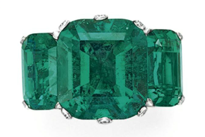 In addition to top colored and colorless diamonds, the Magnificent Jewels sale features an outstanding selection of rare gemstones as well as signed jewels from coveted design firms such as Buccellati, Cartier, David Webb, Tiffany & Co., Van Cleef & Arpels, and Verdura, among others. Among the star lots is an impressive three-stone Colombian emerald ring mounted with an 8.51 carat cushion-cut center stone and flanked by matching emeralds of 4.04 and 3.94 carats, respectively (estimate: $475,000-550,000; pictured page one, right).