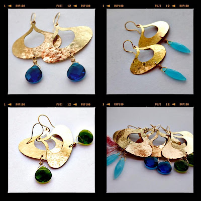Schimpke forged and formed the earrings out of rich yellow brass to which she gave a shimmering, hammered finish. Each earring is accented with wire wrapped briolette drops in olive green or dark navy blue and elongated “dagger” beads of blue chalcedony or cherry quartz. The earrings are available for sale to the public as a limited edition and can be purchased on the Minabea website.