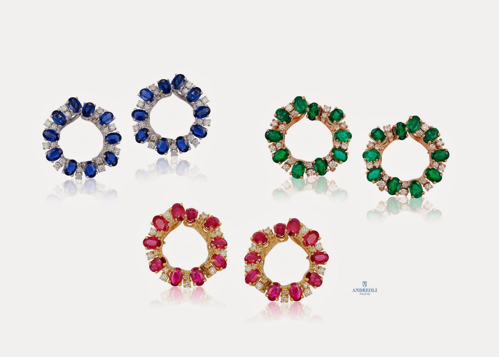 Sapphire Earrings 1.15ct Diamonds, 10.15ct Sapphires, in 18KT White Gold; Emerald Earrings 1.15ct Diamonds 8.30ct Emeralds, in18KT Rose Gold; Ruby Earrings 1.15ct Diamonds, 9.95ct of Rubies, in18KT Yellow Gold |