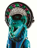 instantaneous introduction of decorative elements from Egyptian culture into fine arts, interior design, fashion and jewelry. At this time, Louis Cartier, a collector of Egyptian antiquities, had the novel idea of reincarnating some of his ancient Egyptian faience fragments by mounting them into modern settings using platinum, diamonds and colored stones.