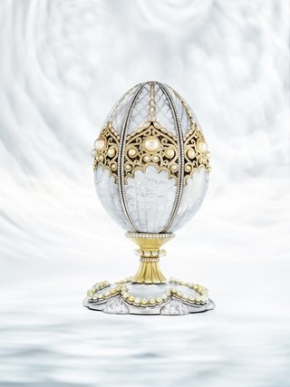 The “Hanging Panda” featuring Mother-of-Pearl with 18K rose gold. The panda is made of 18K white gold with black and white Diamonds (3.69 ctw.). The bamboo is made of white Diamonds (.20 ctw.) and tsavorite Garnets (.28 ctw.). It sits on a silver stand.