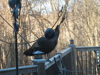 Something just caught my eye on the deck….lots of flapping, big, waving wings! Eyeing the bird feeder, oh no!!