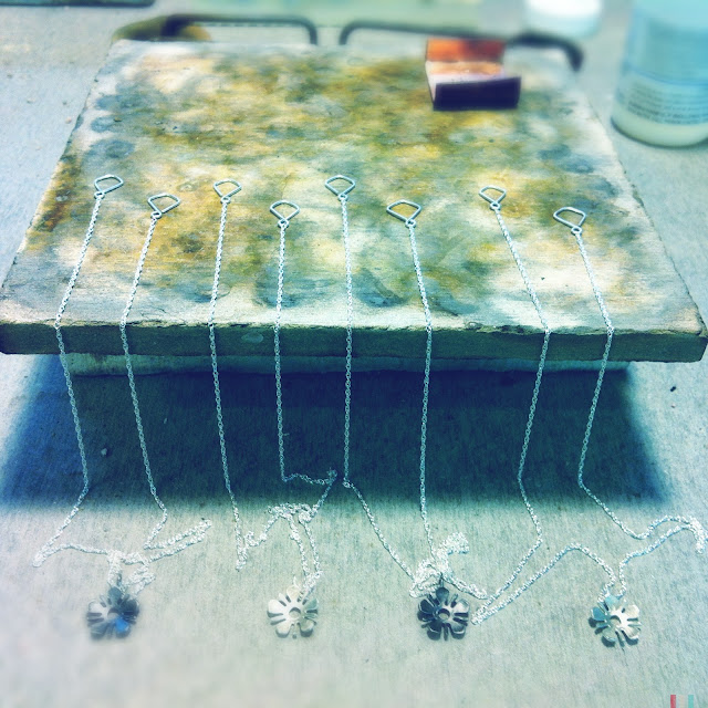 Here is the clasp-cleaning lineup. Once I clean the solder from the clasps I oxidize the chains to match the oxidized flowers. The ones that remain silver get brass brushed for a little shine.