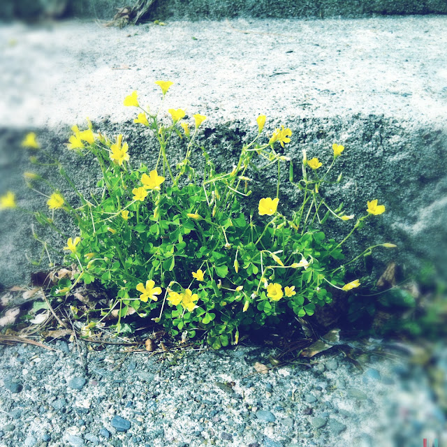 I spend a lot of time taking photos and I spend a lot of time looking them over. I search for themes in my collections. Sometimes I see color themes, some are similar hues and some give stark contrasts, while other themes are cityscapes and iron work. Today I realized I had quite a few pictures of flowers and weeds growing out of cracks in concrete and rock walls, flowers growing through fences meant to contain them and greenery bursting through thick tree trunks.