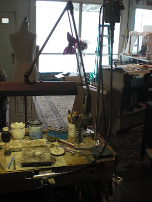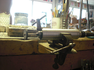 I present: the mini-lathe. I found a miniature vice at an antique shop years ago, and had to have it because it was so very cute. It had no purpose at the time, but followed me for years, and finally a few weeks ago it found it’s golden purpose in life: to hold the handpiece of my flex shaft machine sideways so that it can be used as a miniature lathe! Oh for joy! It is seen below used with a abrasive-impregnated rubber cylander for sanding and polishing small parts– especially the ends of earring posts.