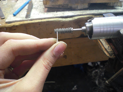 The flexible shaft machine is a common tool among different types of craftspeople, and an outright necessity to a jeweler. For the unfamiliar: it is a handheld rotary tool like a drill with a long flexible cord that attaches to a hanging motor. It is similar to a Dremmel tool, (what they use in nail salons to buff acrylic nails) but more powerful.