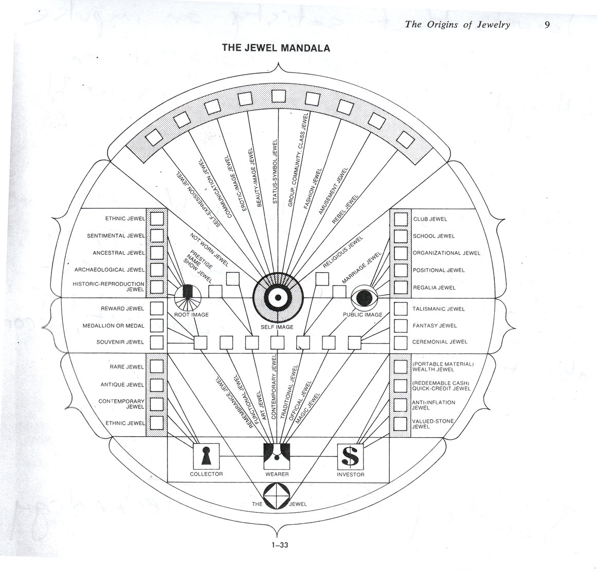 He writes” The mandala deals with the functions that jewelry serves the wearer. Staring with the more basic uses which are later subdivided…..All of these uses relate to areas that consern basuc aspects of the human being: the self image, the root image, and the public image.”