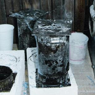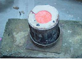 11. The cooling water will cause the scrap wax to form a bond with the investment when it hits the water. The flask should be quenched for a few seconds then removed from the water. A sharp tool should be used to break open the investment on both ends. The quenching cycle should them be continued.