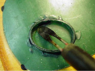 Place the hot mold flask on the wax shavings on the solder pad. The wax will immediately melt and seal the bottom of the flask to the solder pad, which prevents air from entering the investment mold and metal from the bottom side.