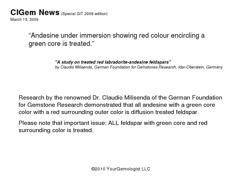 You may remember that Mr James claimed at the 2009 Tucson Gem Show that the recent flood of Red Andesine was instead treated Feldspar…his report started a rumble in the Industry that has resulted in a trip to the “mine” – lawsuits – the discrediting of an Olympic Games collectible gemstone (did you buy the Chinese Andesine Olympic Gems from DSN as natural?)…and now in 2010 Robert James was back with his latest report “Andesine – The Final Chapter”.
